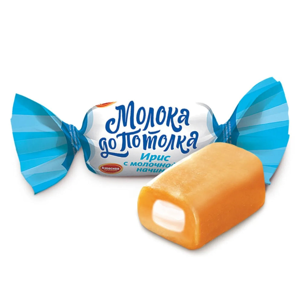 Milk-filled toffee (Ирис с молочной начинкой) is a soft caramel candy with a creamy milk center. It offers: