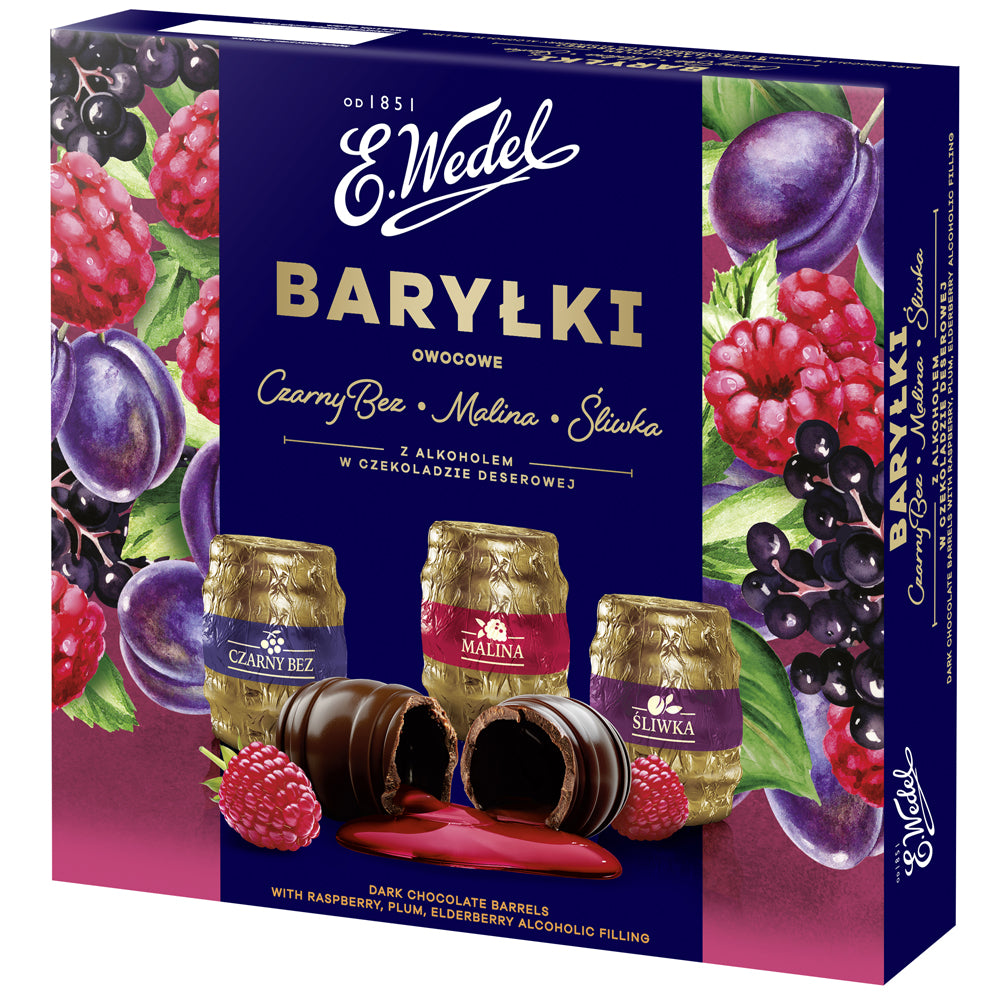 Discover the refined delight of E.Wedel Baryłki Fruit Chocolates — dark chocolate barrels filled with rich, aromatic elderberry, raspberry, and plum liqueur centers. Each little “barrel” hides a warm, flavorful liqueur wrapped in smooth, decadent dark chocolate that melts gently and luxuriously.