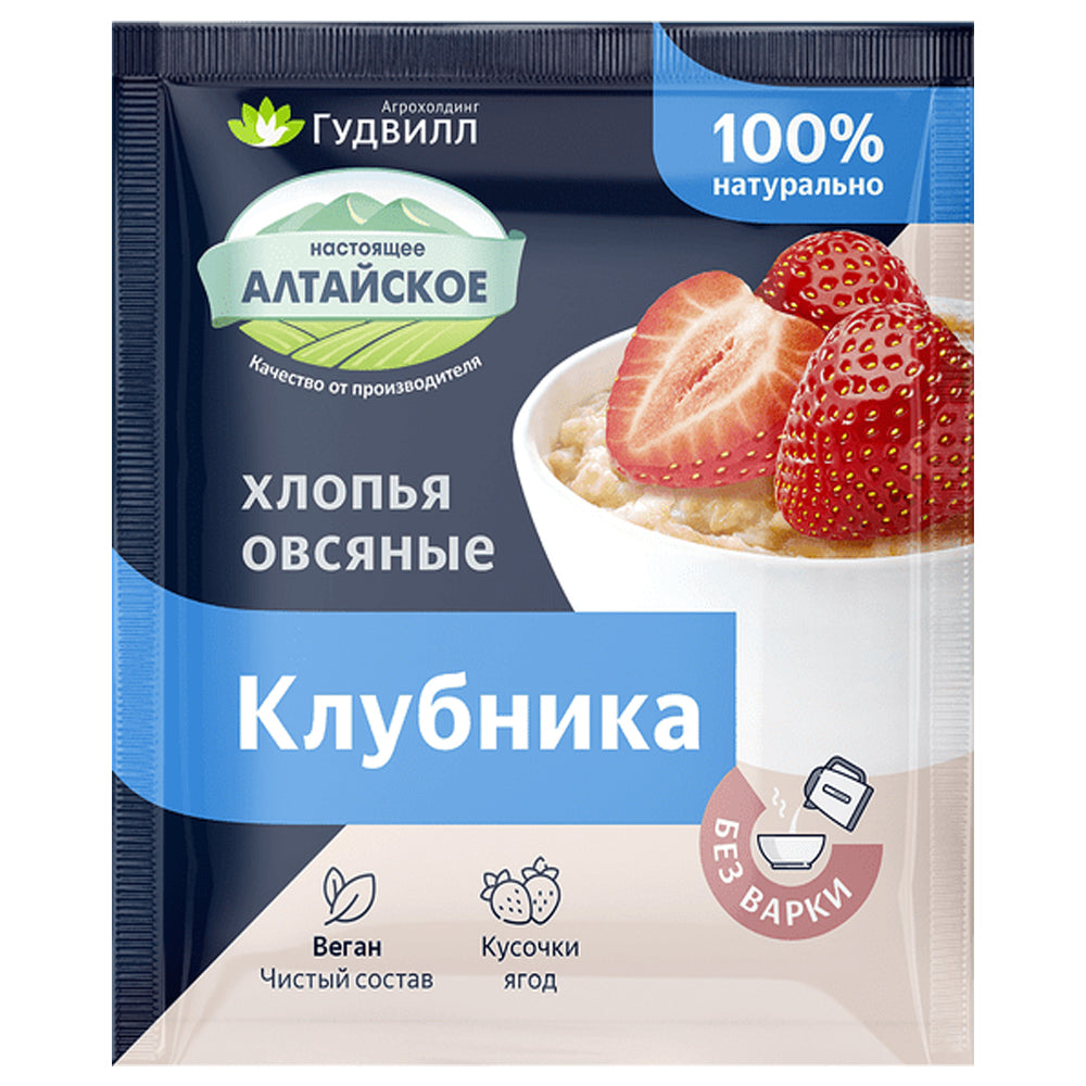 Состав: овсяные хлопья, не требующие варки, сахар, сублимированная клубника, соль.