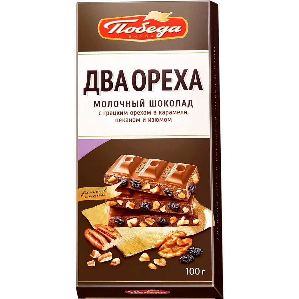 Молочный шоколад с грецкими орехами, пеканом и изюмом «Два ореха», Победа, 100 г/3,5 унции